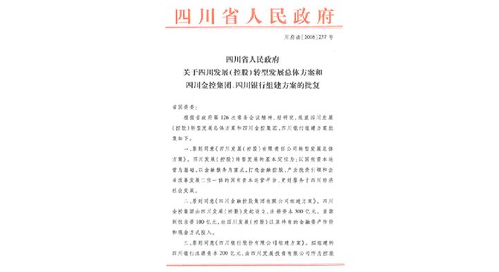 組建注冊資本300億元人民幣的四川金融控股集團,首期出資100億元人民幣。